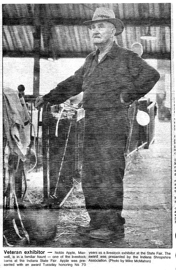 I have been asked by The Indiana Shropshire Sheep Association to write this nomination to the National Shropshire Hall of Fame for my grandfather, Noble T. Apple. Since he passed away almost 30 years ago many Shropshire Breeders today are not aware of his Shropshire and community accomplishments.